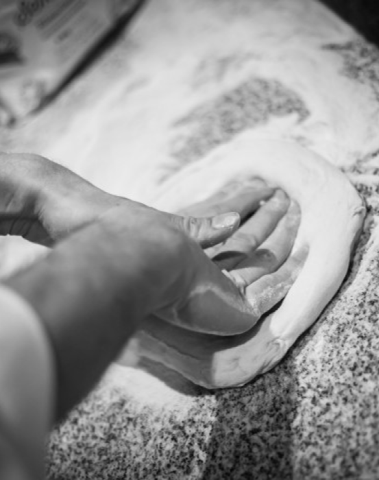 Sauce tomate, mozzarella fior di latte, jambon de Parme, mozzarella di bufala, tomates confites, copeaux de parmesan, pesto, taggiasche olives et roquette